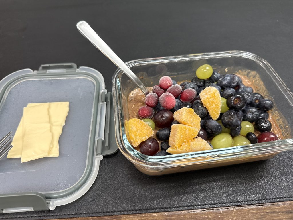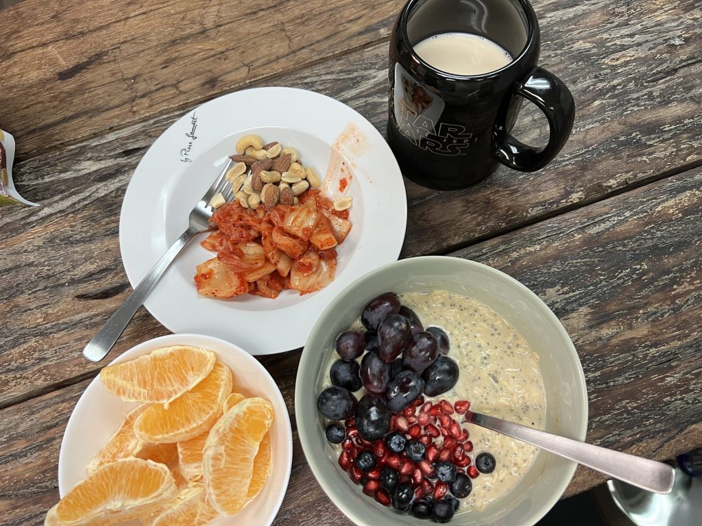 Breakfast is oats. Sometimes I start mixing oats with soy milk at the point I want to have them and sometimes I will prepare overnight oats. Top it off with fresh and frozen fruits.